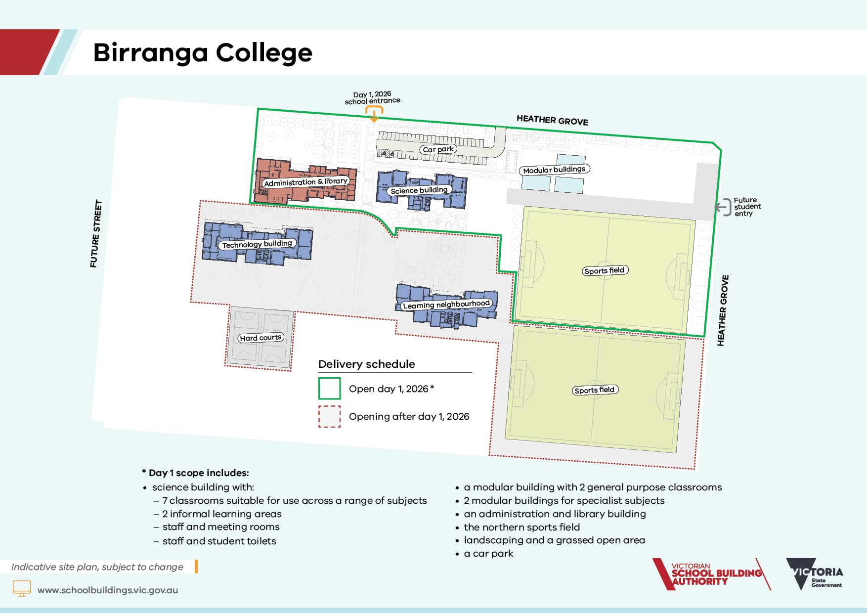 In its first year of operation, Birranga College will open to Year 7 students only. An additional year level will be added each following year. The 2026 school zones are available at findmyschool.vic.gov.au.